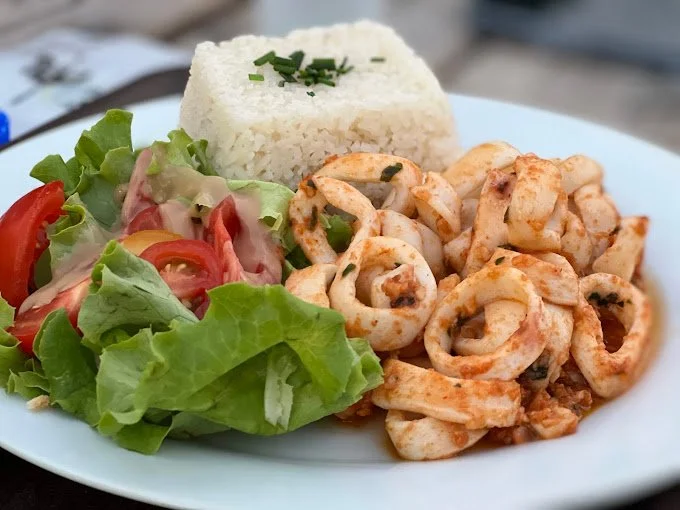 La moqueca de poisson est un plat traditionnel brésilien servie avec gambas ,encornets et riz à la Brésilienne